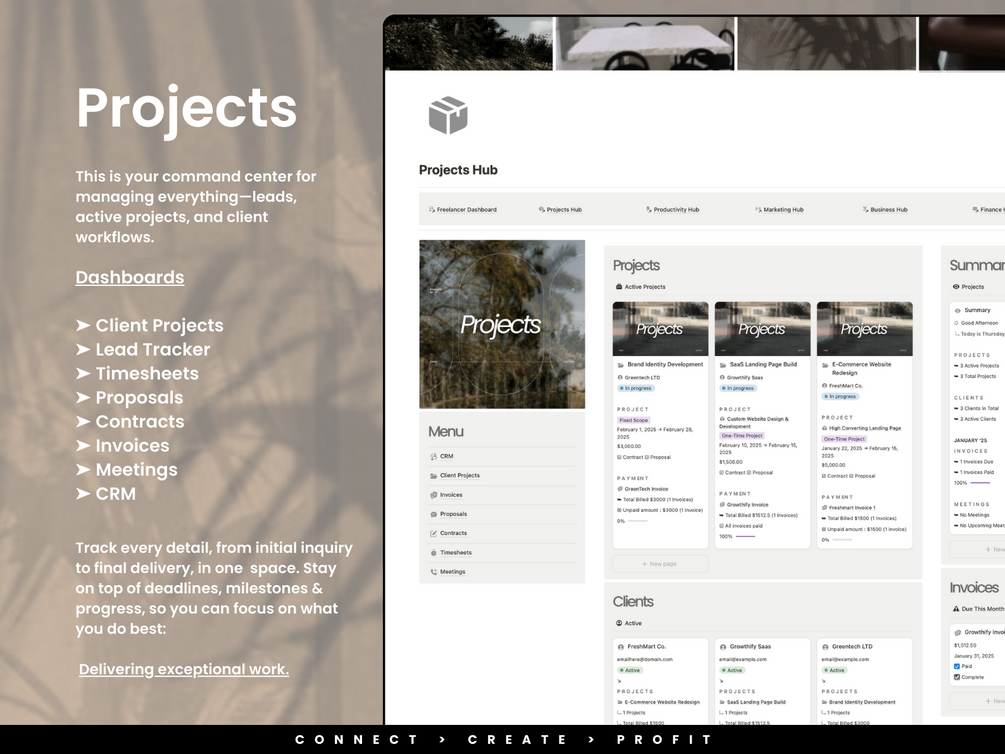 π Projects Hub β Keep everything flowing smoothly from first contact to final invoice.