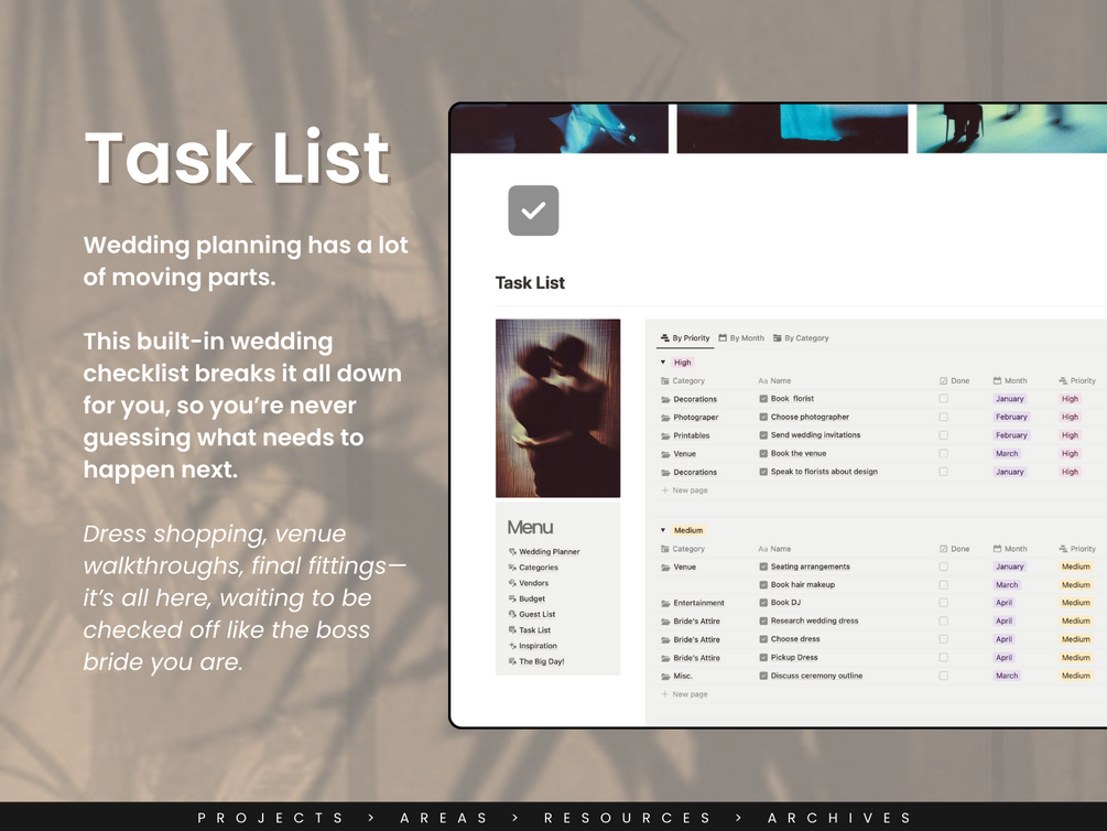Let’s get you down the aisle—stress-free and stunning, with your all-in-one Notion wedding planner. This system keeps every detail organized so you can focus on celebrating, not stressing.